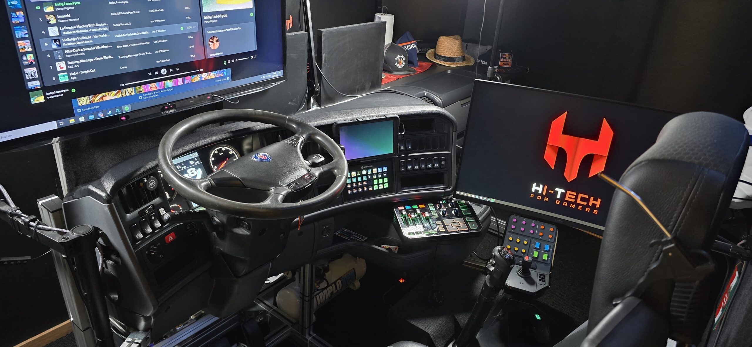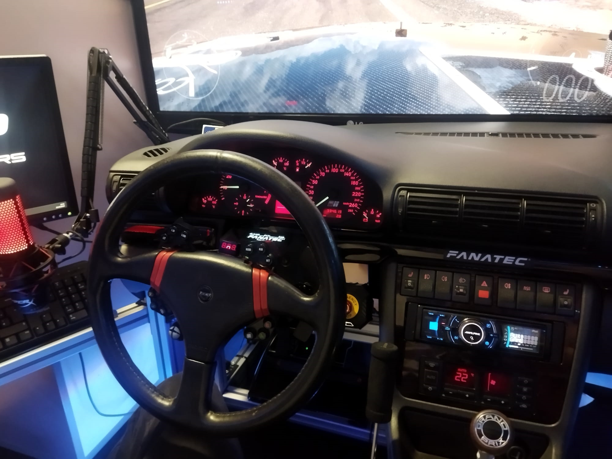 Aus einem Audi A4 B5 wurde das Cockpit vollständig ausgebaut und auf einem Aluminium Vierkantprofil Simrig von uns aufgebaut.